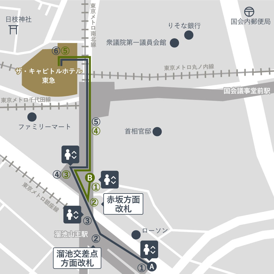 銀座線ホーム(6両目付近)エレベーターで地下2階から地下3階ヘ下がってください。