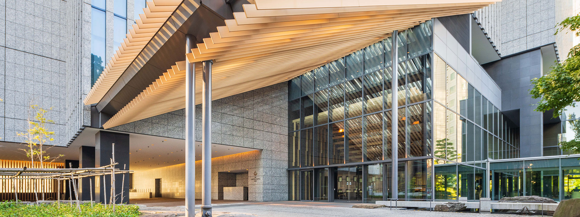 建築家隈研吾氏によるデザインは、ボリュームのある白木の庇と、打ち水を思わせるエントランスまで廻りこむ池の水が日本のお出迎えの姿を表現しております。またメインロビーにある草月流いけばなは毎月作品が変わり季節の移ろいをお楽しみいただけます。