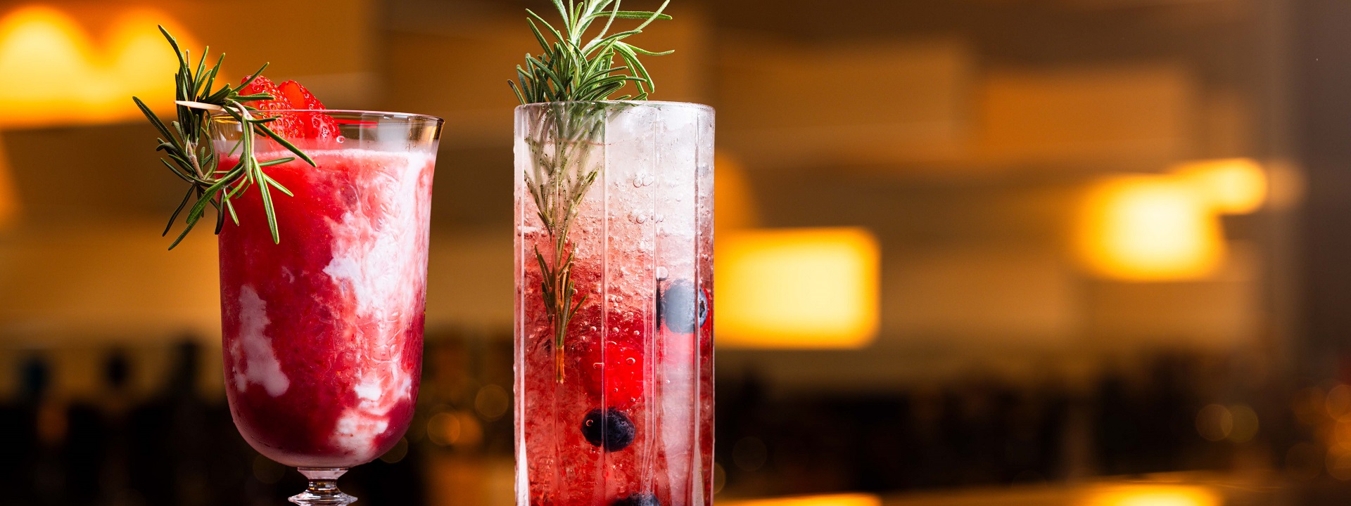 すり潰した苺をホワイトチョコレートのリキュールとラムで仕上げる甘露な一杯。リースに見立てたローズマリーから漂うすっきりとした香りが、カクテルをより上品に昇華させます。(写真左)