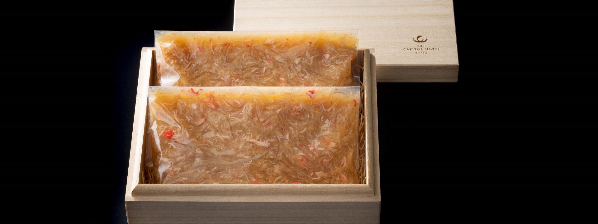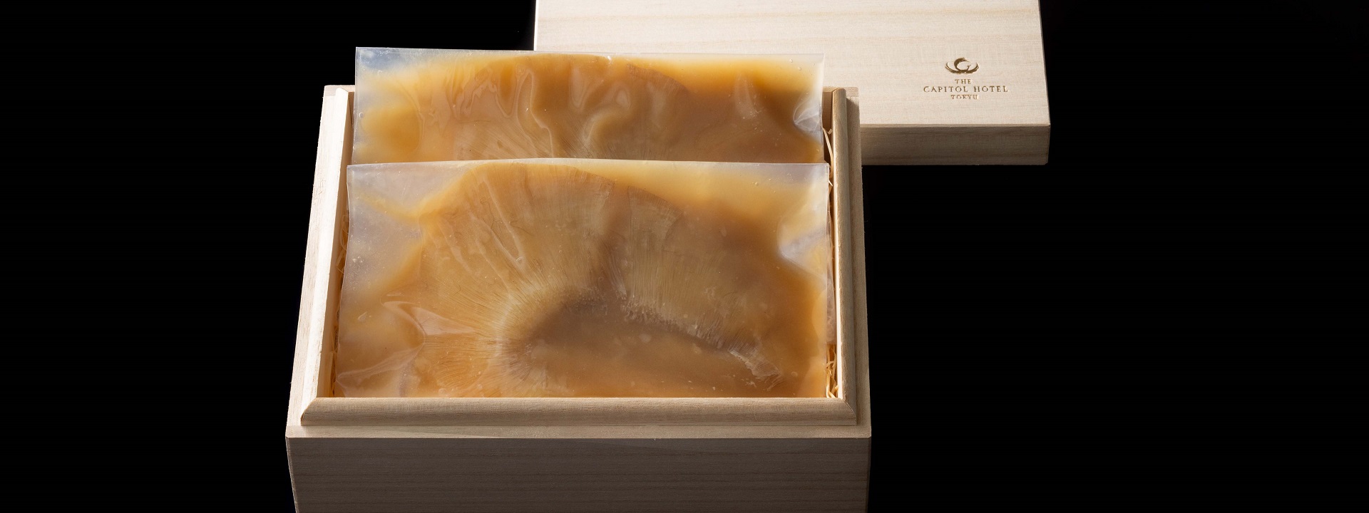 ヨシキリザメの尾びれを使用した「ふかひれの姿煮」を2枚ご用意いたしました。姿煮の決め手はスープともいわれています。星ヶ岡では鶏肉と豚肉をベースに長時間強火で煮込んだコクのある白湯スープに、醤油、オイスターソース、葱油を入れたとろみのあるスープをふかひれと一緒に煮込み上質な味わいに仕上げました。