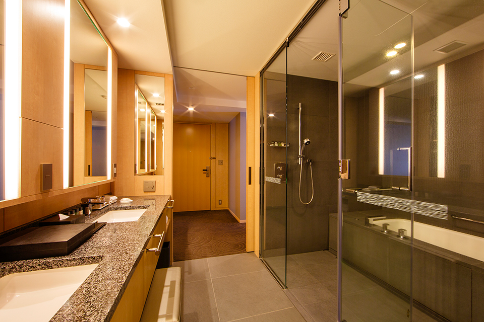 ウェットエリアとパウダースペースが独立したバスルーム、2台の洗面カウンター