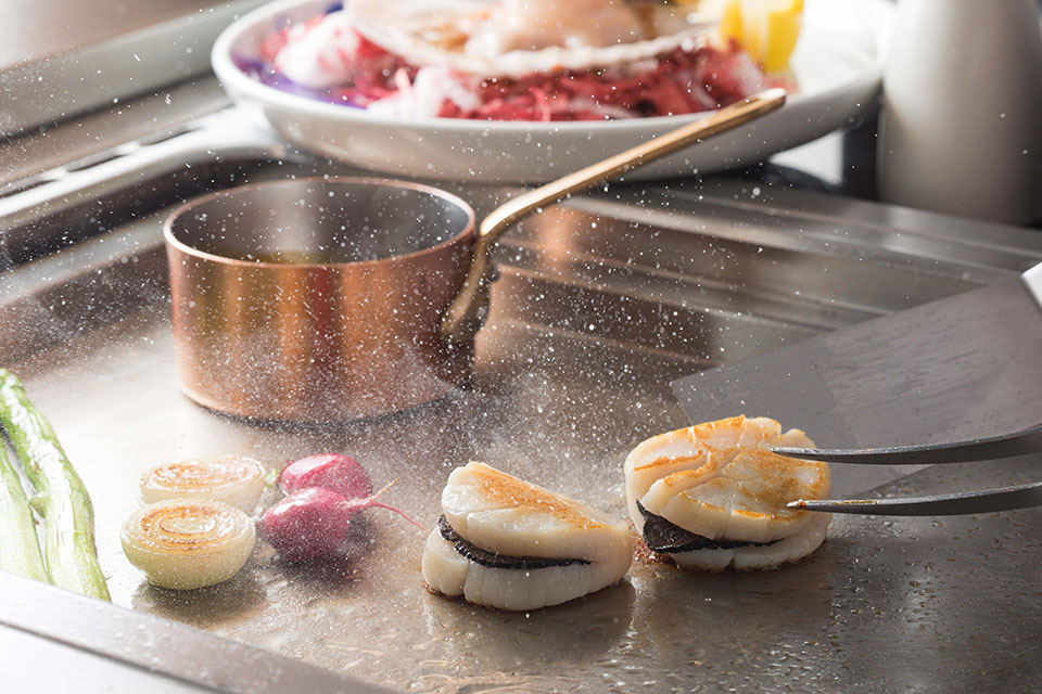 和、洋の鮮やかな前菜をはじめ、日替わりのグリルメニューは、目の前の鉄板で仕上げる出来立てを味わえます。オリジナルラベルの日本酒、ジャパニーズウィスキーなど厳選したアルコールとともに、東京の夜景を眺めながらお楽しみください。