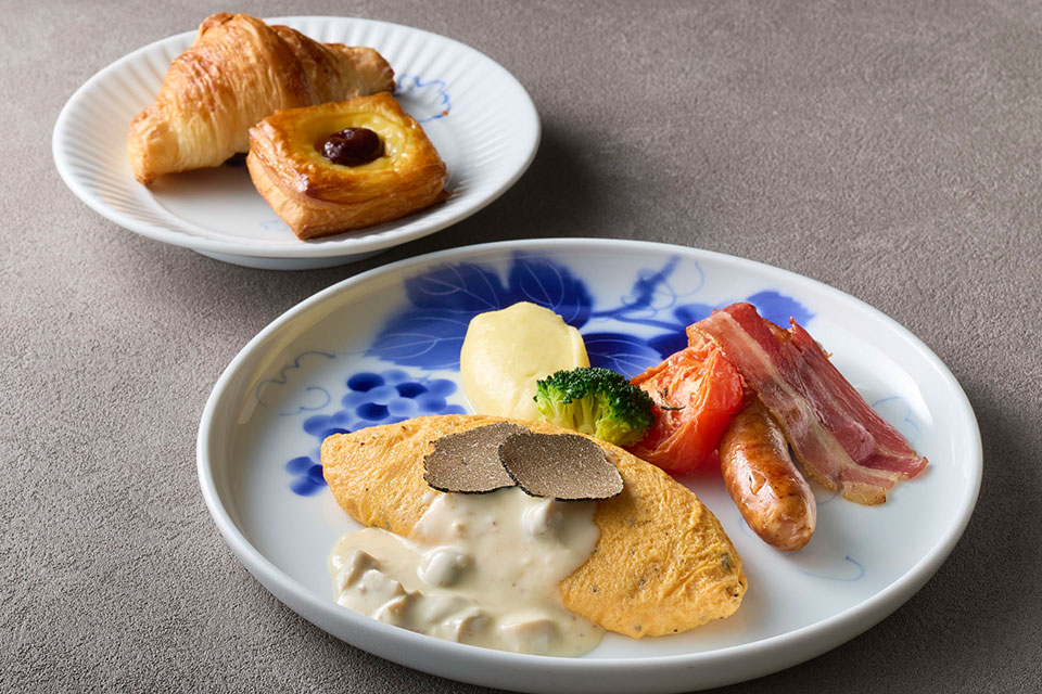 クラブラウンジ限定で提供しているトリュフオムレツをはじめ、作りたての卵料理をご用意しております。彩り豊かな前菜やフルーツなどはビュッフェスタイルでご提供いたします。