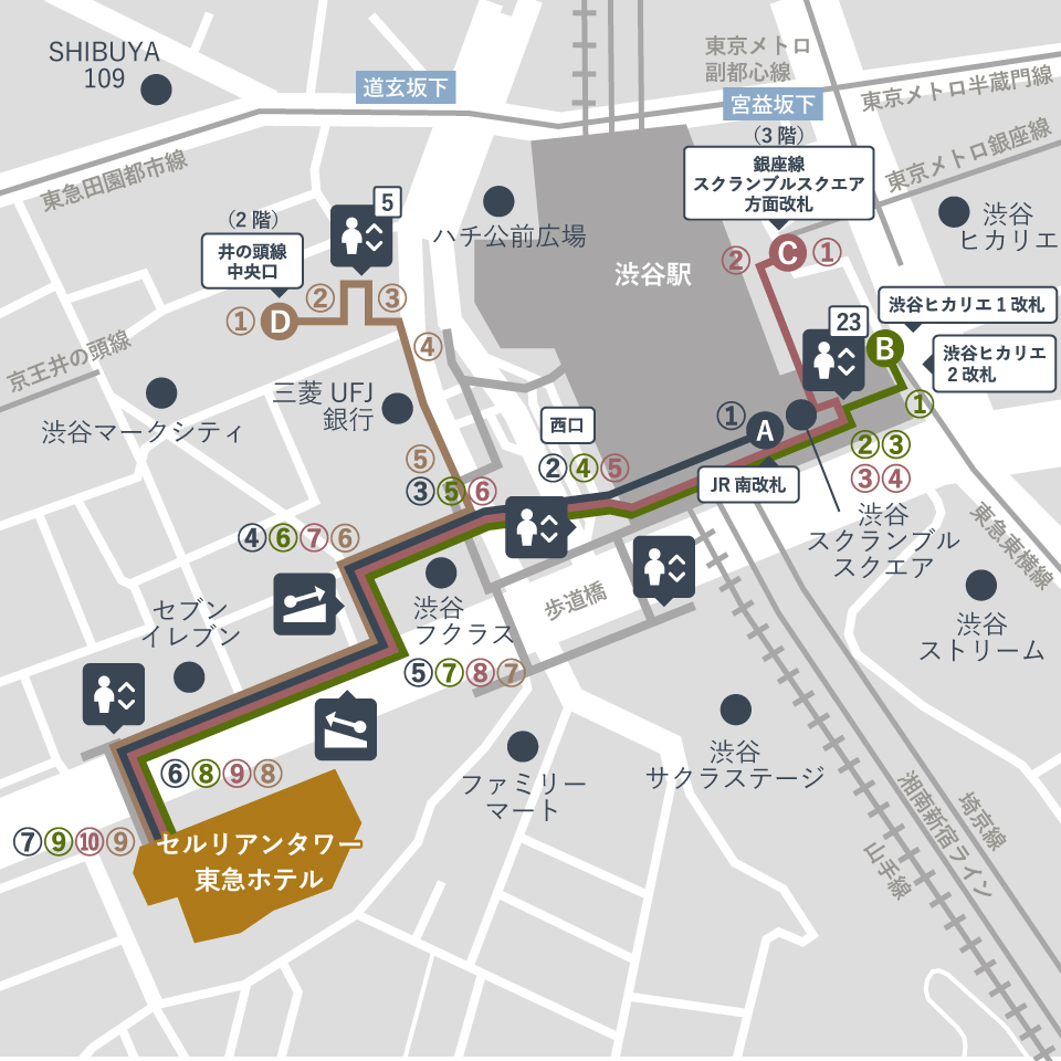 「渋谷ヒカリエ1改札」からは右、「渋谷ヒカリエ2改札」からは左に出て正面階段の左側にあるエレベーター(23)にお進みください。