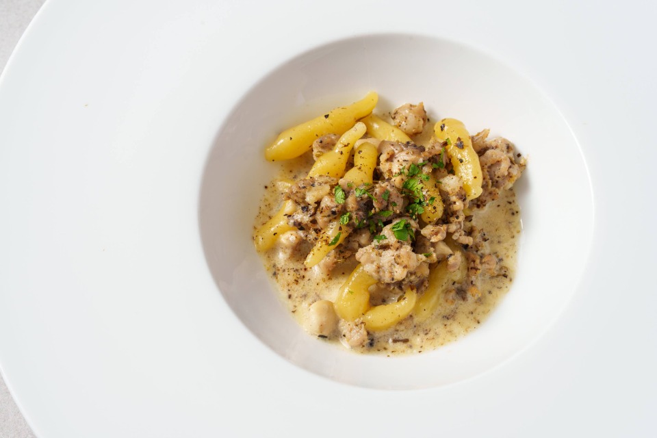 ハーブを効かせた豚肉の自家製パスタ