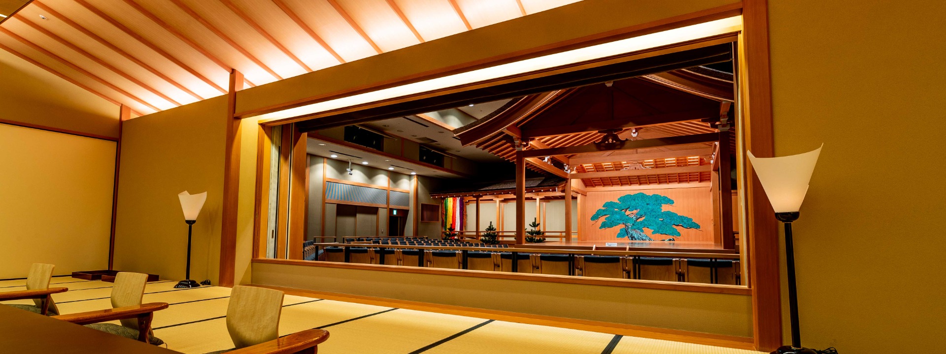 広間(30畳)・次の間(12畳)・茶室(6畳)からなる伝統的な建築様式である数寄屋造りで、隣接する能楽堂を借景として望めます。