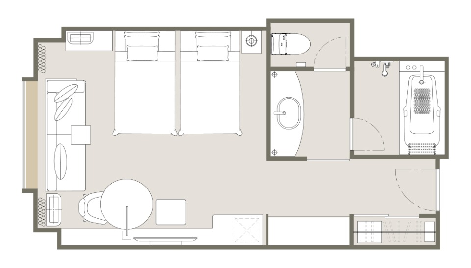お部屋の間取りはあくまで一例です。面積や家具の配置、備品などはお部屋により異なりますので、あらかじめご了承ください。
