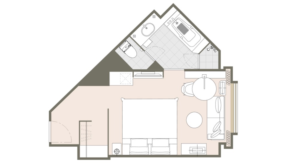 お部屋の間取りはあくまで一例です。面積や家具の配置、備品などはお部屋により異なりますので、あらかじめご了承ください。