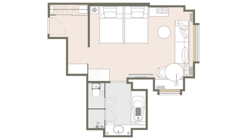 お部屋の間取りはあくまで一例です。面積や家具の配置、備品などはお部屋により異なりますので、あらかじめご了承ください。