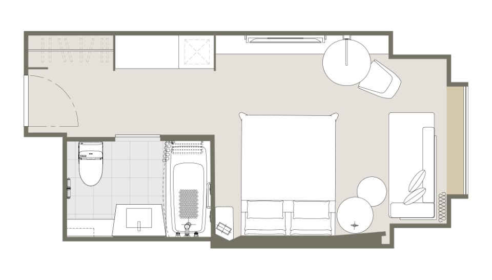 お部屋の間取りはあくまで一例です。面積や家具の配置、備品などはお部屋により異なりますので、あらかじめご了承ください。