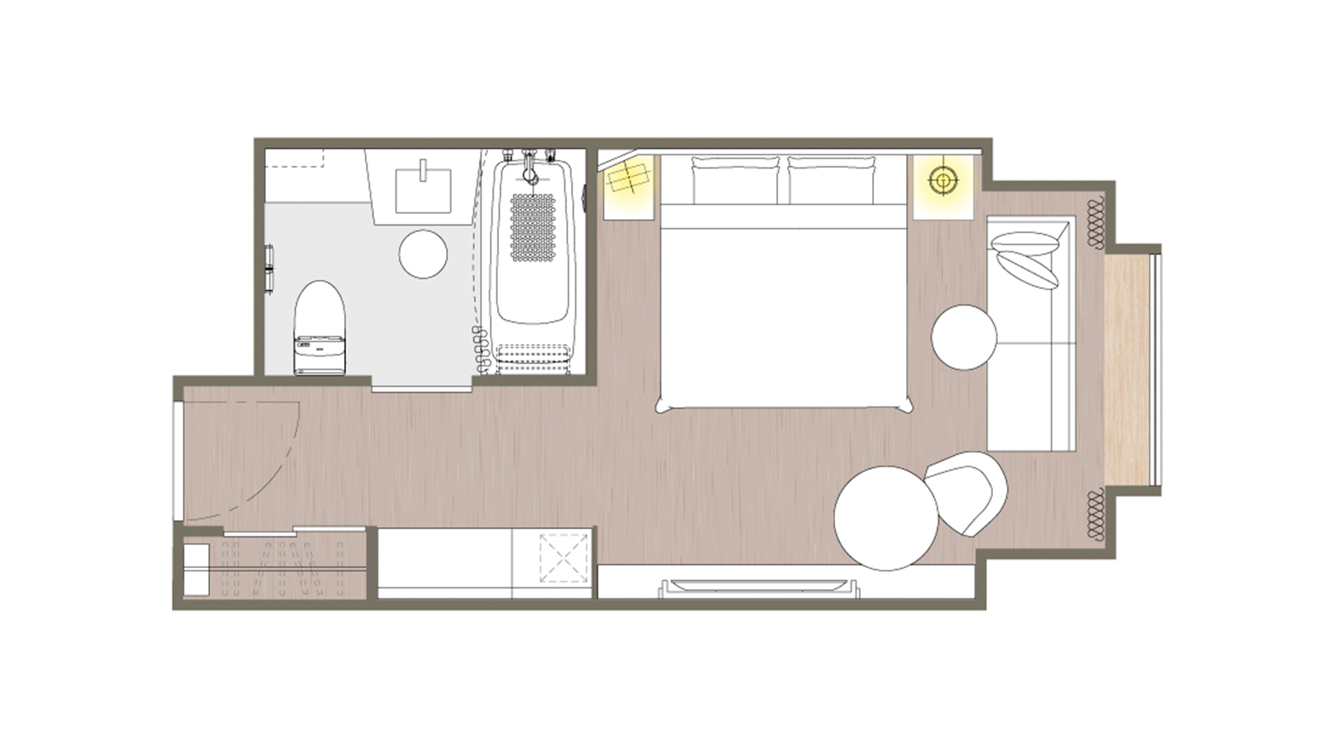 お部屋の間取りはあくまで一例です。面積や家具の配置、備品などはお部屋により異なりますので、あらかじめご了承ください。