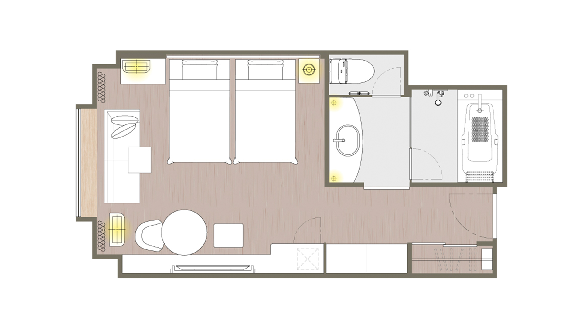 お部屋の間取りはあくまで一例です。面積や家具の配置、備品などはお部屋により異なりますので、あらかじめご了承ください。