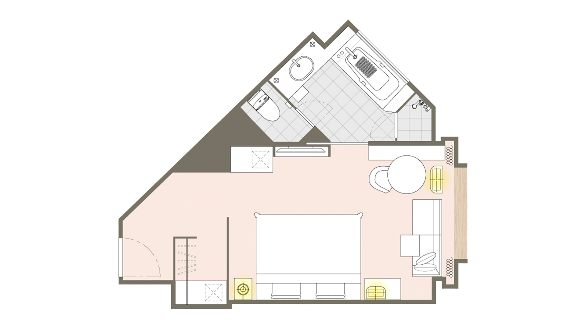 お部屋の間取りはあくまで一例です。面積や家具の配置、備品などはお部屋により異なりますので、あらかじめご了承ください。