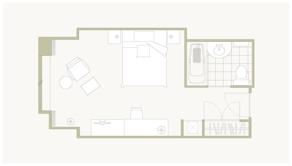 お部屋の間取りはあくまで一例です。面積や家具の配置、備品などはお部屋により異なりますので、あらかじめご了承ください。