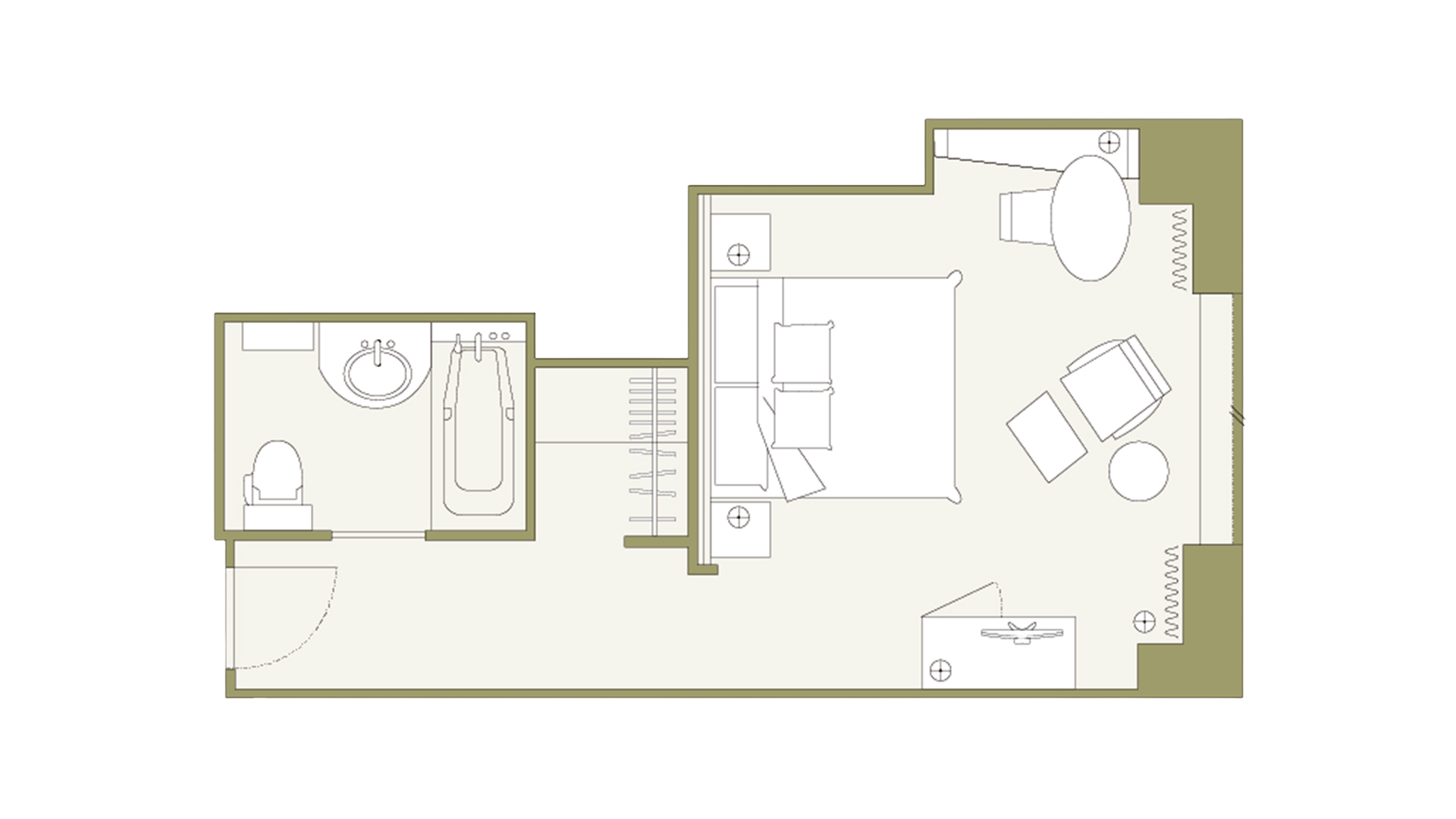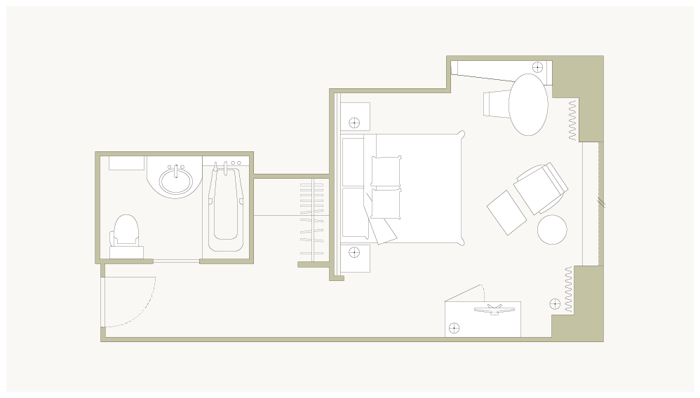 お部屋の間取りはあくまで一例です。面積や家具の配置、備品などはお部屋により異なりますので、あらかじめご了承ください。