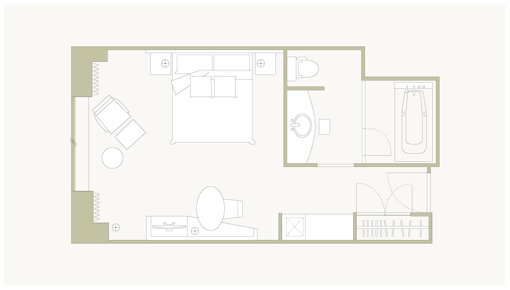 お部屋の間取りはあくまで一例です。面積や家具の配置、備品などはお部屋により異なりますので、あらかじめご了承ください。