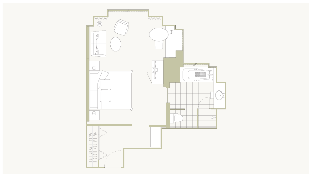 お部屋の間取りはあくまで一例です。面積や家具の配置、備品などはお部屋により異なりますので、あらかじめご了承ください。