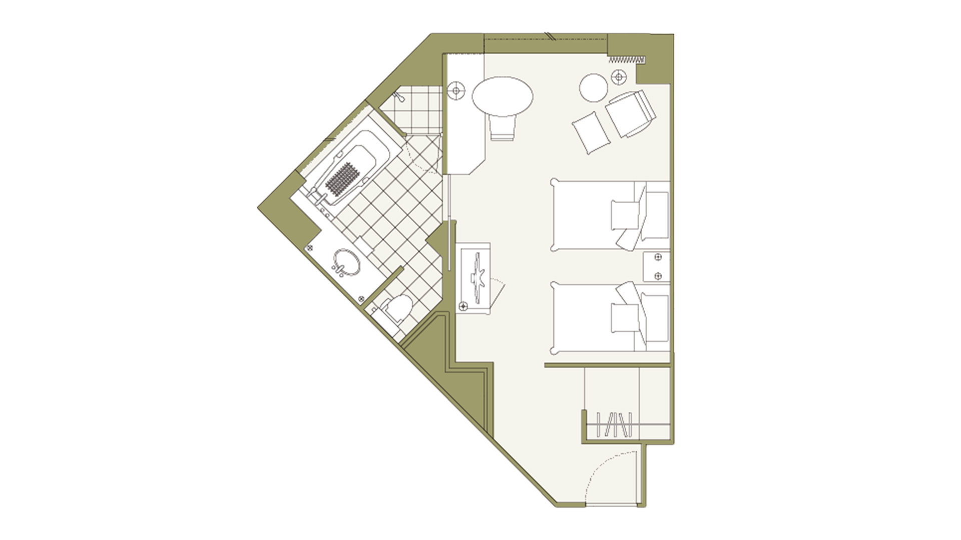 お部屋の間取りはあくまで一例です。面積や家具の配置、備品などはお部屋により異なりますので、あらかじめご了承ください。
