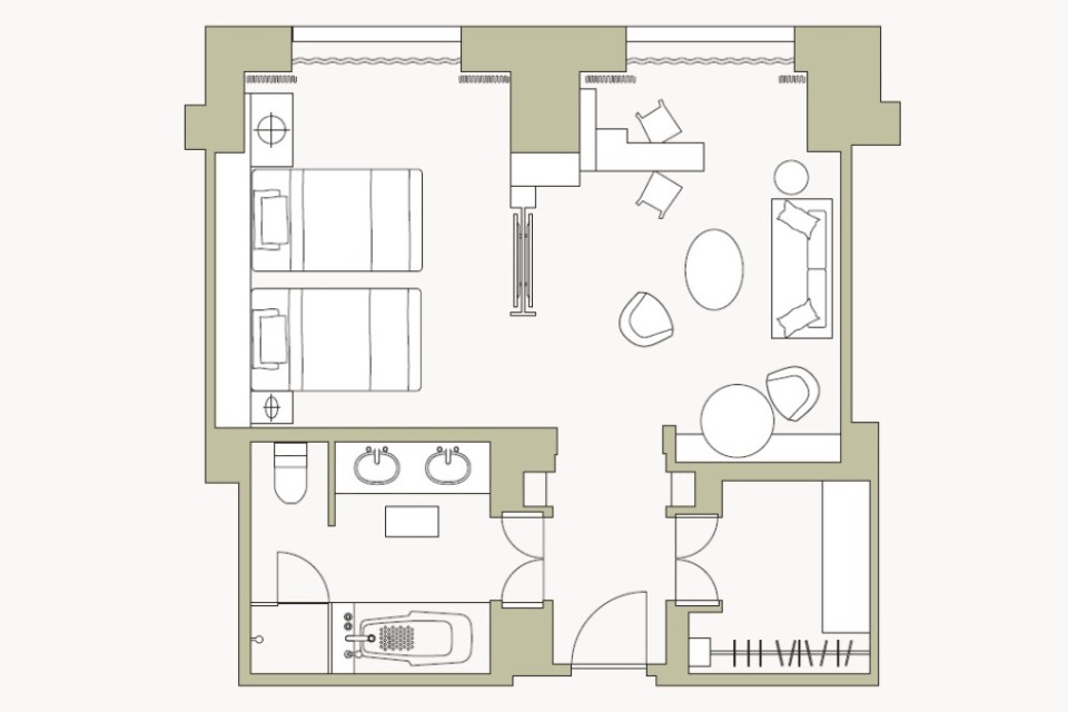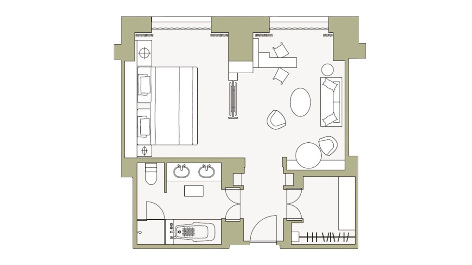 お部屋の間取りはあくまで一例です。面積や家具の配置、備品などはお部屋により異なりますので、あらかじめご了承ください。