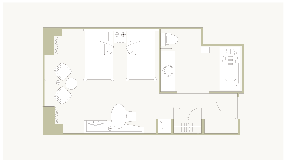 お部屋の間取りはあくまで一例です。面積や家具の配置、備品などはお部屋により異なりますので、あらかじめご了承ください。