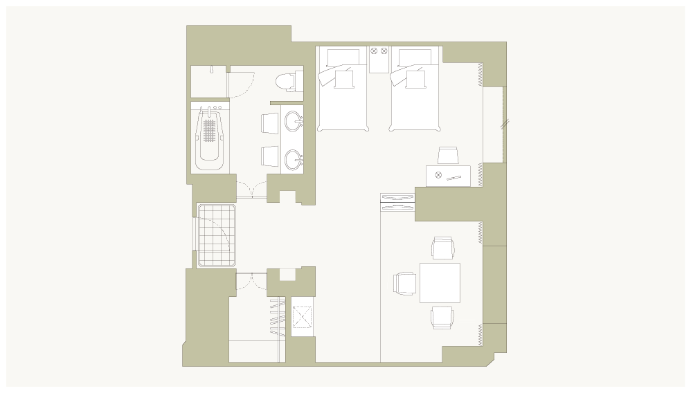 お部屋の間取りはあくまで一例です。面積や家具の配置、備品などはお部屋により異なりますので、あらかじめご了承ください。
