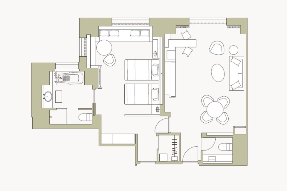 お部屋の間取りはあくまで一例です。面積や家具の配置、備品などはお部屋により異なりますので、あらかじめご了承ください。