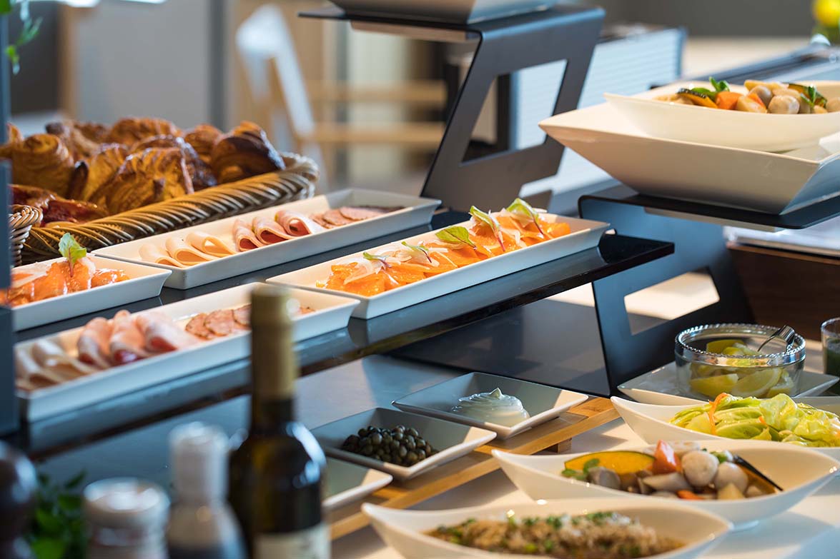 ホテルのベーカリーからお届けするパンや、薫り高いコーヒー、サラダ、冷製ハム、ヨーグルト、シリアルなどをご用意しております。爽やかな朝のひとときをお楽しみください。