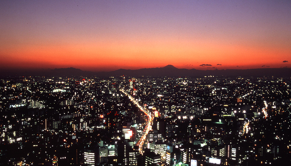 国道246号線のオレンジのヘッドランプと赤いテールランプが、夕焼けに黒いシルエットで映る富士山にまっすぐに伸びていく…。