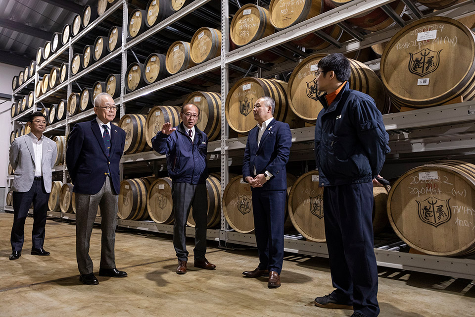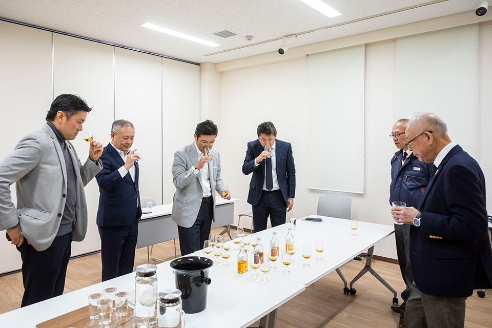 本ウイスキーづくりでは、当社のパーパスである「ひととまちと、こころ満たされる時間(とき)を創る」に根差し、そのコンセプトを“お客さまに寄り添い、こころ満たされる時間(とき)をつくる”としました。お客さまとの多様な接点で、ウイスキーを介して思い出に残る時間(とき)を共に作りたいとの想いから始まったもので、2024年3月に当社社長・村井を中心としたプロジェクトメンバー4名が長野県にあるマルス駒ヶ岳蒸溜所を訪れ、ベースとなる原酒を選びました。