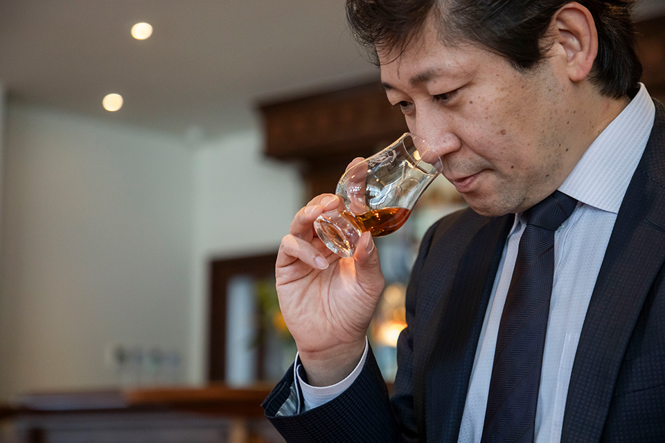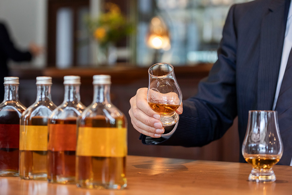 このウイスキーのベースは、国内外のコンペティションで数多くの受賞歴を持つ本坊酒造のモルト原酒「駒ヶ岳」。エレガントタイプ、シェリー樽の深みのあるタイプ、ピートの効いた香り高いタイプなどから、華やかな香りを持ち、様々なシチュエーションに合わせられるアメリカンホワイトオークの新樽を選びました。樽選定に参加したBELLUSTAR TOKYO, A Pan Pacific Hotel のビバレッジディレクター・吉田茂樹は、ホテルでウイスキーが飲まれるシーンは食前・食中・食後など様々であることから、“お客さまに寄り添う”このプロジェクトではいかなる場面にも合わせられるウイスキーであることを重視した、と語ります。