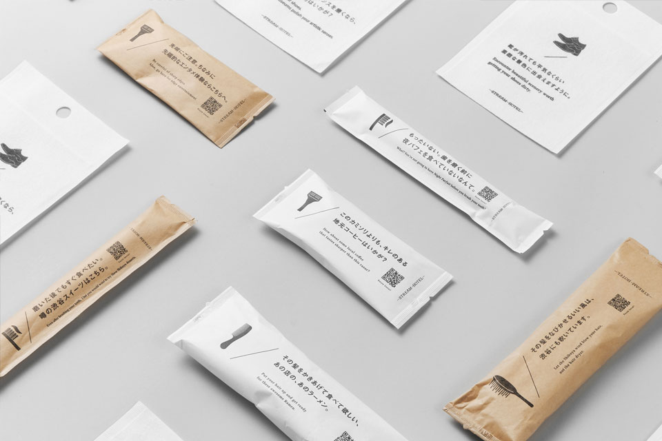 「STREAM HOTEL」を象徴するユニークなデザインは、日本伝統の紋様「流水紋」をモチーフとした、流れる(=ストリーム)ラインをベースとし、その上にホテルが立地するエリアの有名なスポットや特産品を抽象的にかたどったカラフルなモチーフを重ねて構成。ホテルグッズやアイテムとして旅の思い出づくりを彩りながら、お客さまとホテルスタッフとの会話のきっかけにもなっています。またアメニティにはウィットの効いた様々なコピーをデザインし、思いがけず近隣のスポットやお店と出会えるような仕掛けをつくるなど、ホテル・お客さま・地域の接点を創出しています。