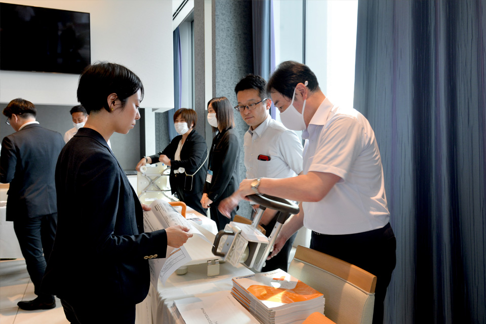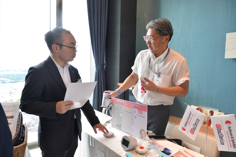 バス用滑り止めマット、バスグリップ、シャワーチェア、トイレ用手すり、聴覚障害者宿泊用機器、バイキングカートを陳列、それぞれの企業の方に正しい使用方法や使用時の注意点を説明していただきました。