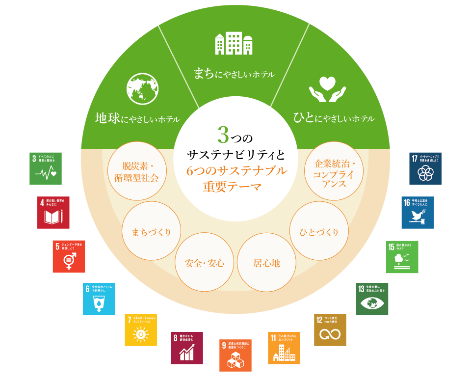 3つのサステナビリティ(目指す姿)と6つのサステナブル重要テーマ(社会課題の中から重点的に取り組んでいくテーマ)を定め、SDGs(持続可能な開発目標)の観点を深く認識しながら、ホテル事業を通じて「持続可能な社会」の実現に貢献してまいります。