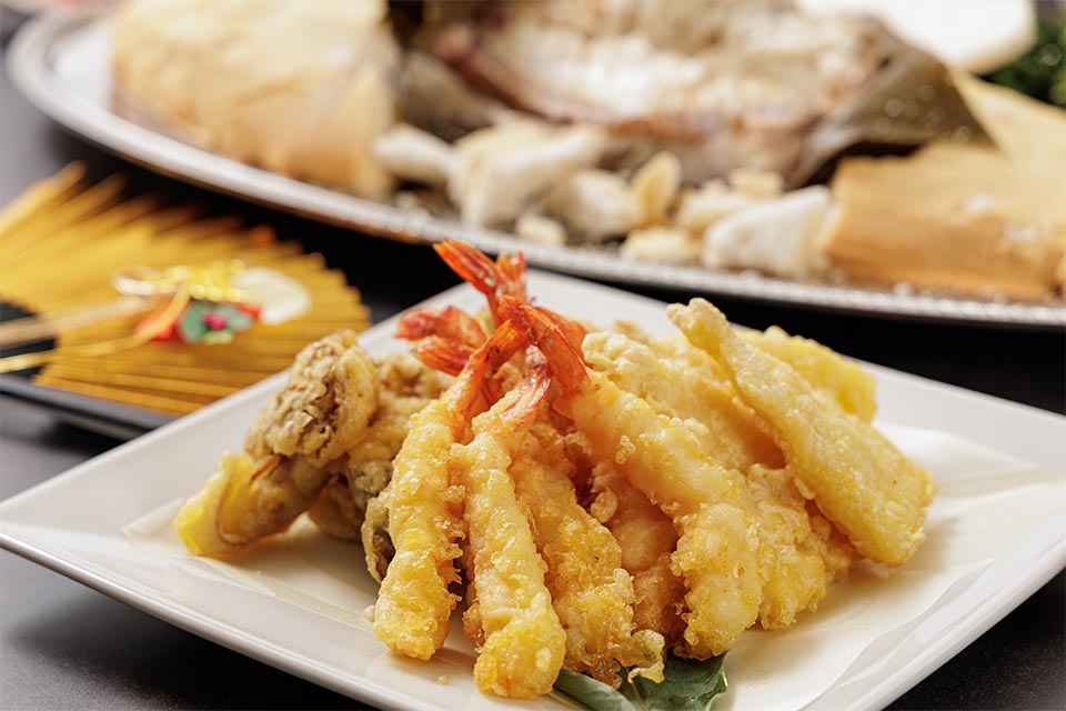 兵庫県産「はりま牛」の鉄板焼きをはじめ、にぎり寿司、鯛の塩釜焼き、ブリのしゃぶしゃぶなど、