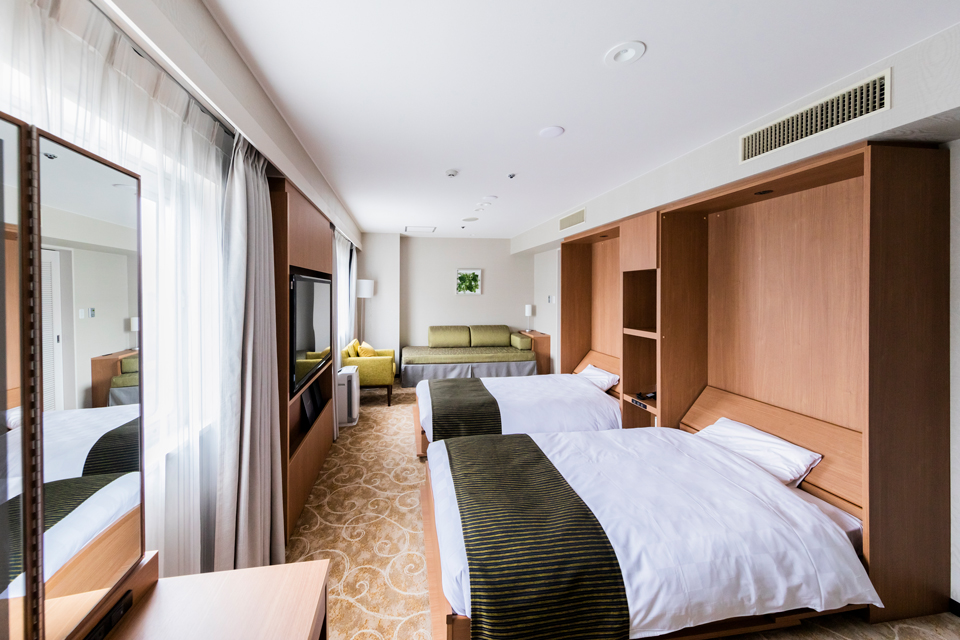 4名さまの場合 ソファーベッド、エキストラベッド(90 x 190cm)での対応となります