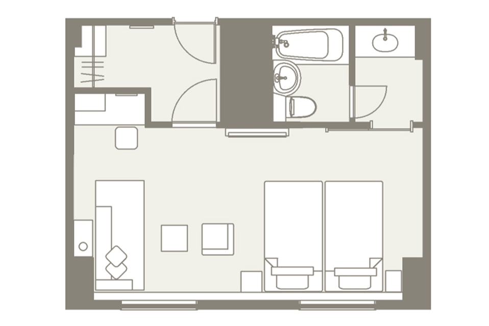 お部屋の間取りはあくまで一例です。面積や家具の配置、備品などはお部屋により異なりますので、あらかじめご了承ください。