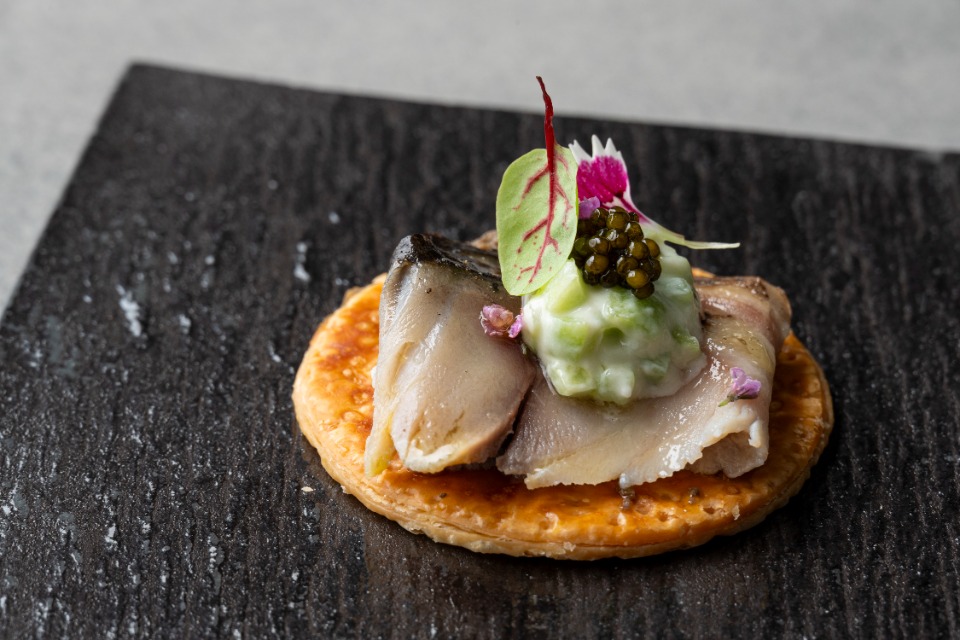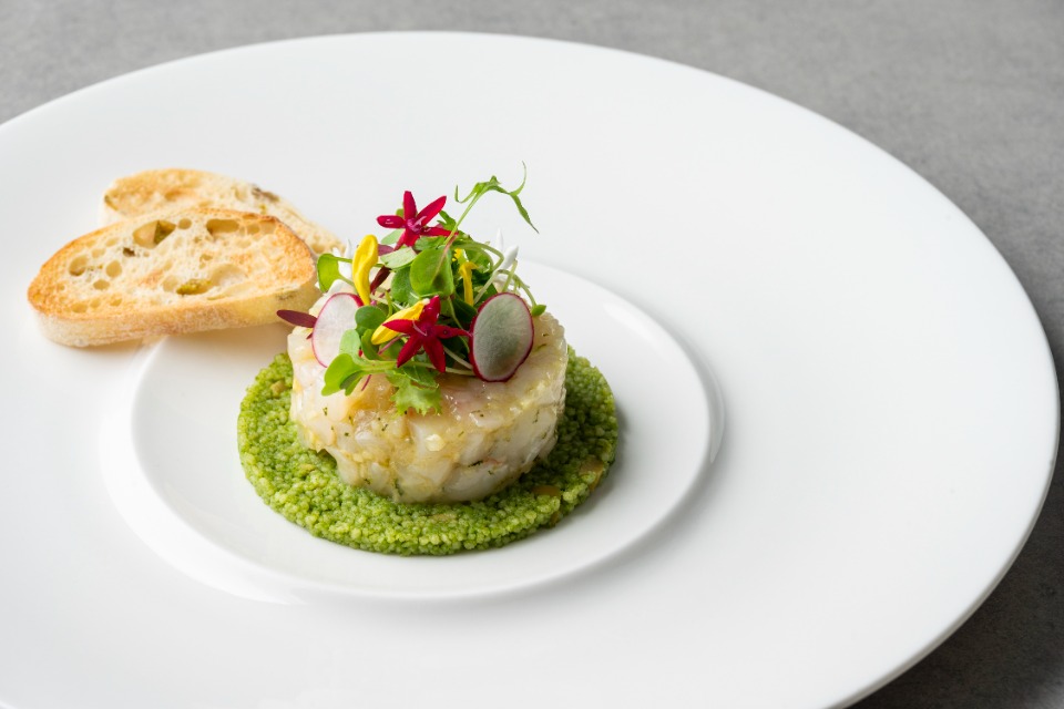 平貝と甘海老のタルタル ルッコラのタブレ 柚子ヴィネグレット