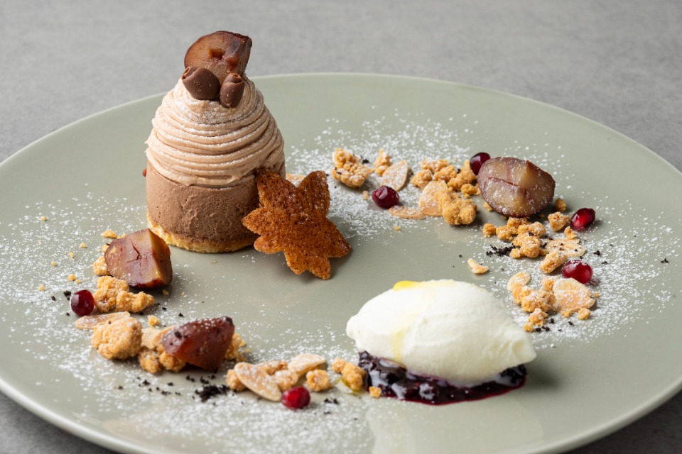 オリーブオイルのアイスと栗のモンブラン仕立て