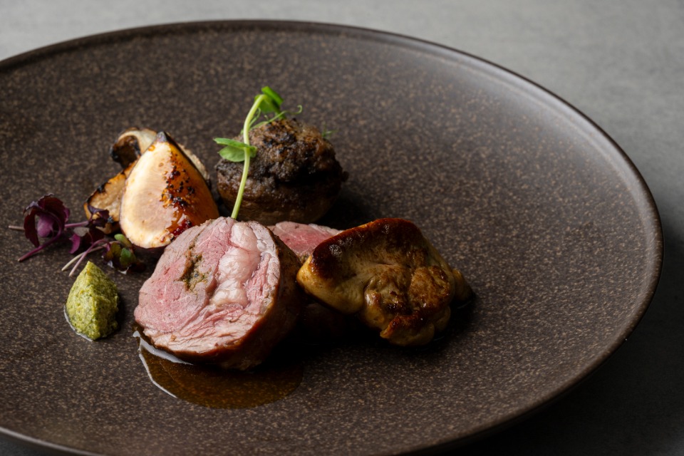 仔羊のルローとフォアグラ グリーンオリーブの香り シャルキトリーを詰めたシャンピニオン