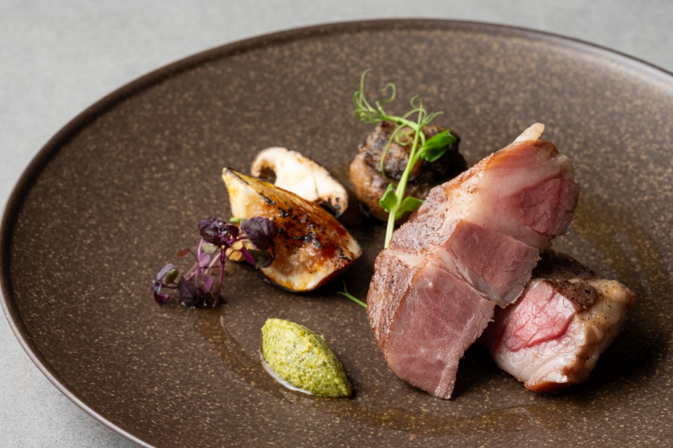 イベリコ豚のロティ グリーンオリーブの香り シャルキトリーを詰めたシャンピニオン