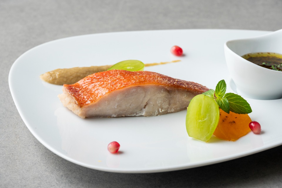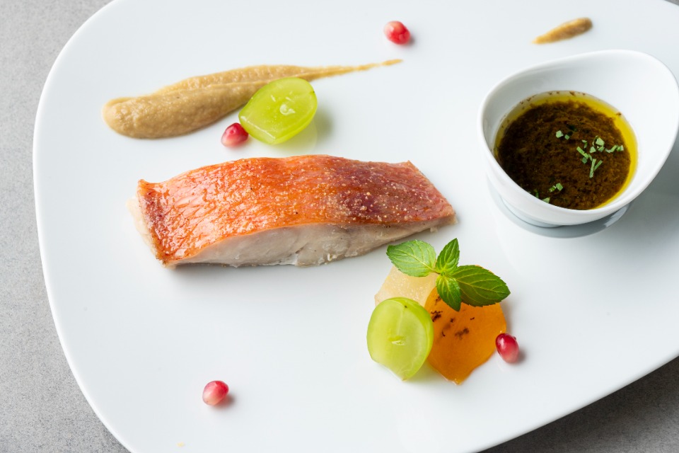 下田産金目鯛のヴァプール オリーブソースとフルーツピクルス