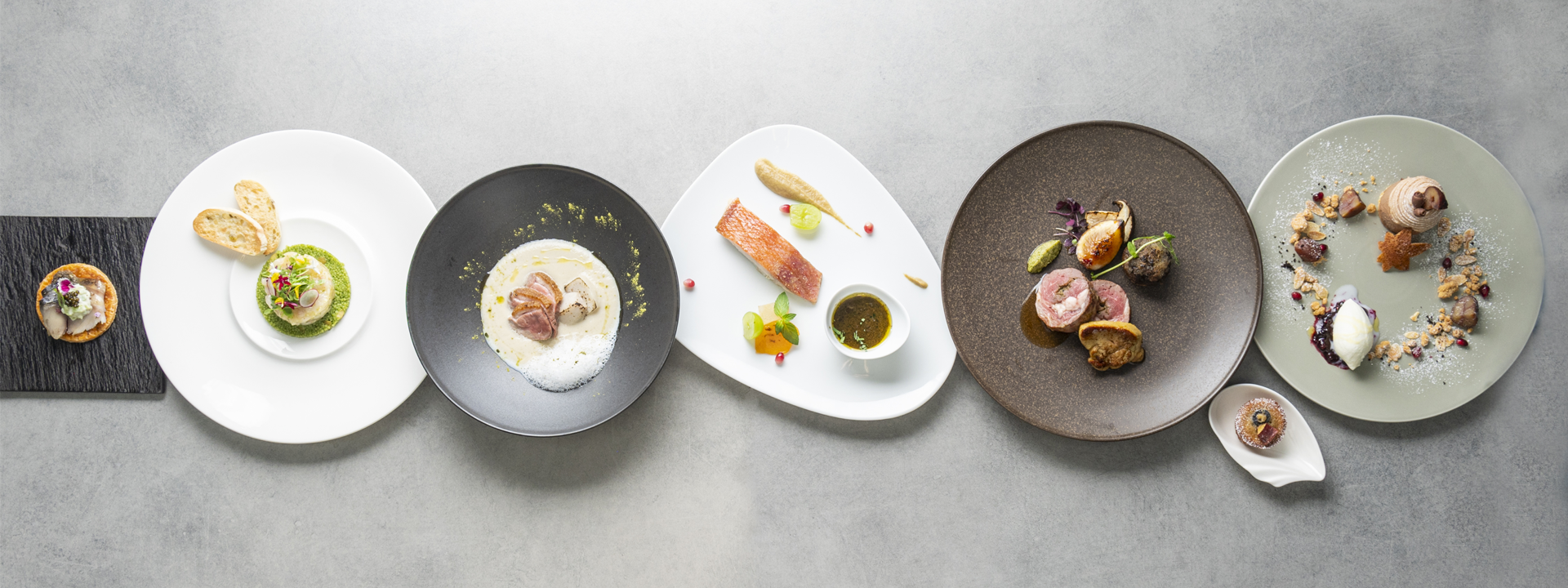 料理長 長谷川が収穫時期を迎える「オリーブ」に着目し、青々しい草のような香りとまろやかな苦みのある味わいを一皿ごとにご堪能いただけます。趣向を凝らし、秋の味覚を存分にお楽しみいただけるフレンチコースとなっております。
