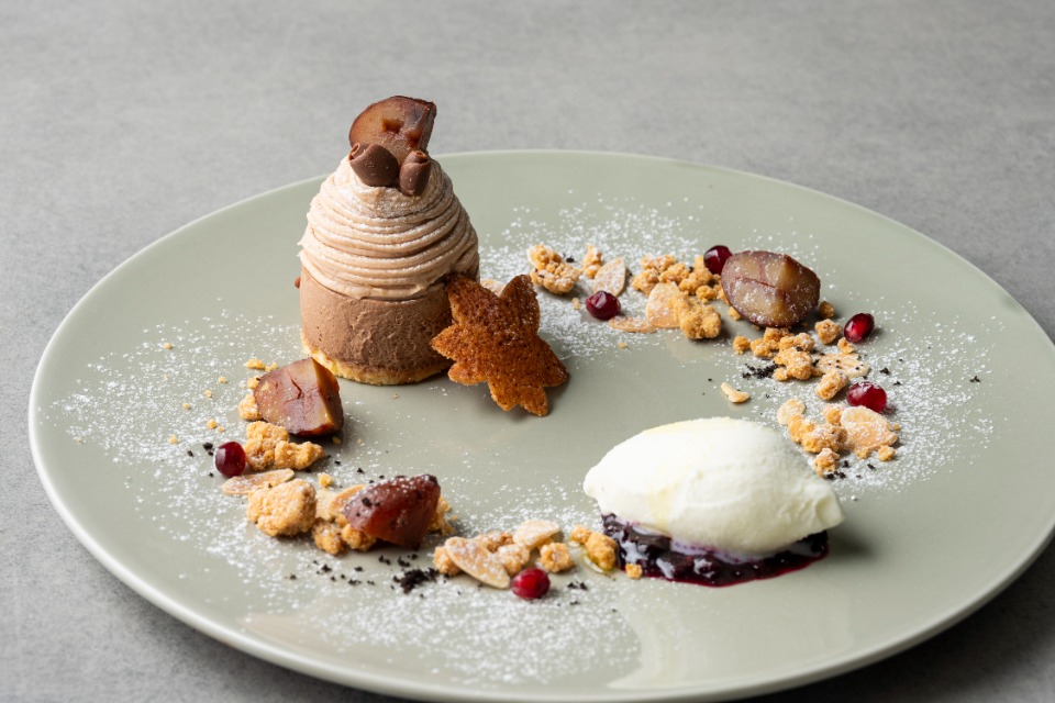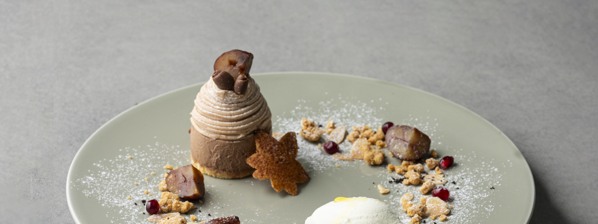 オリーブオイルのアイスと栗のモンブラン仕立て