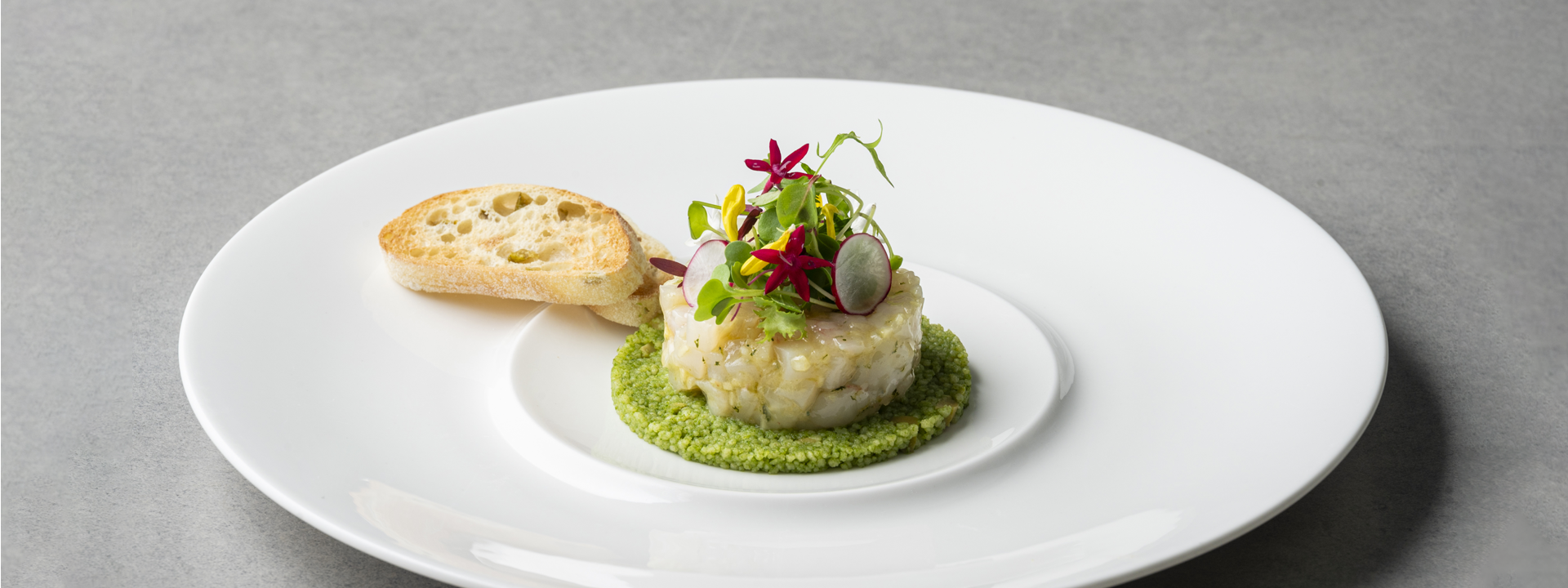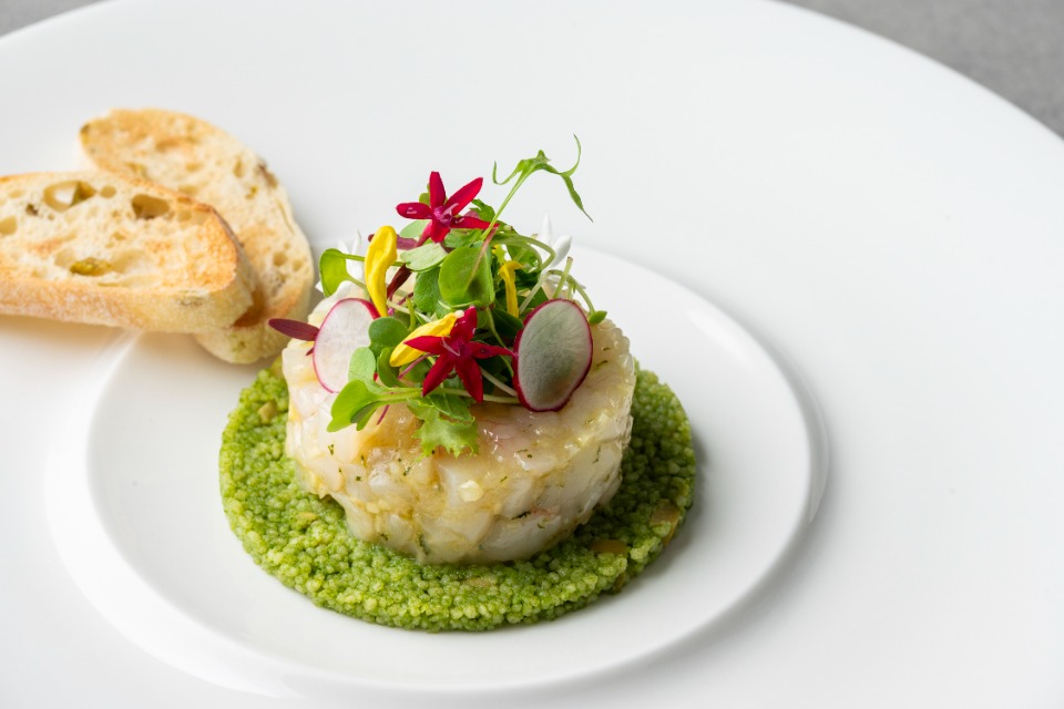 平貝と甘海老のタルタル ルッコラのタブレ 柚子ヴィネグレット