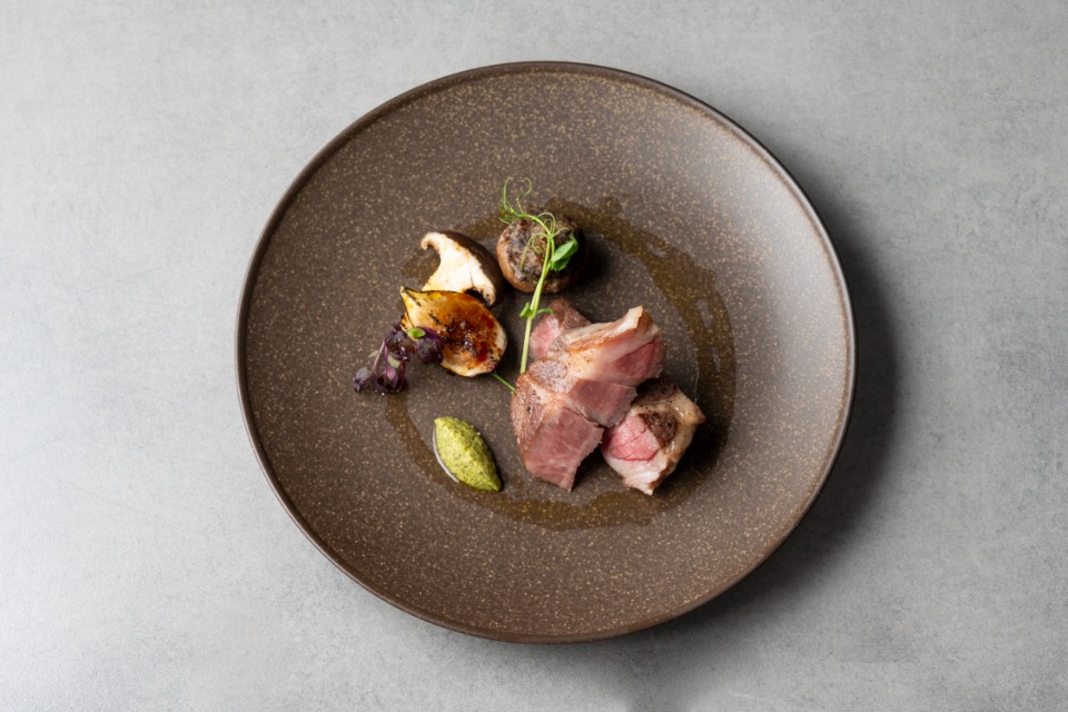 イベリコ豚のロティ グリーンオリーブの香り シャルキトリーを詰めたシャンピニオン