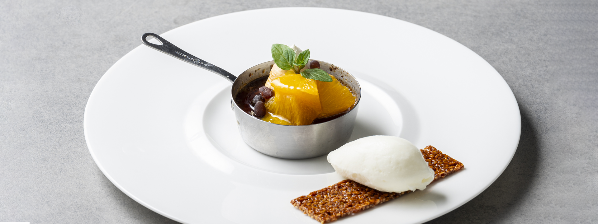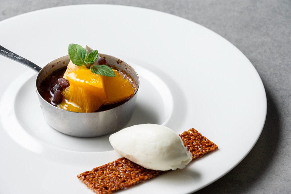 クレームブリュレ ほうじ茶風味 柑橘と塩ミルクアイスを添えて