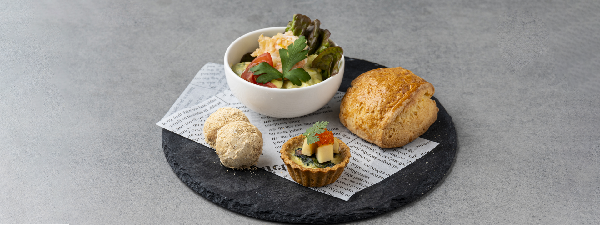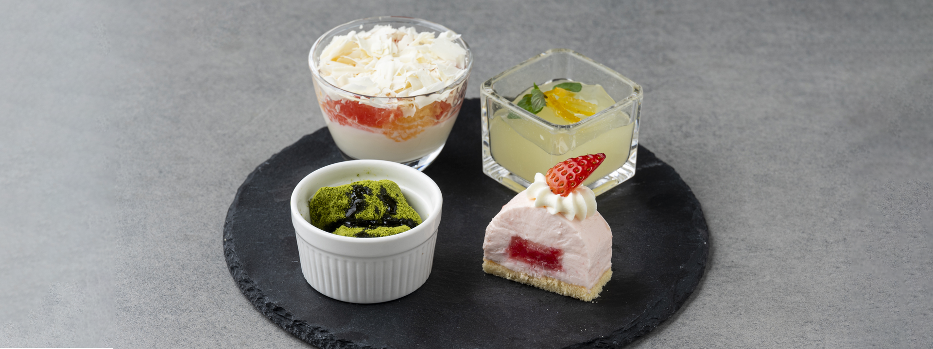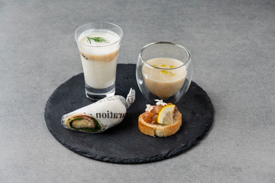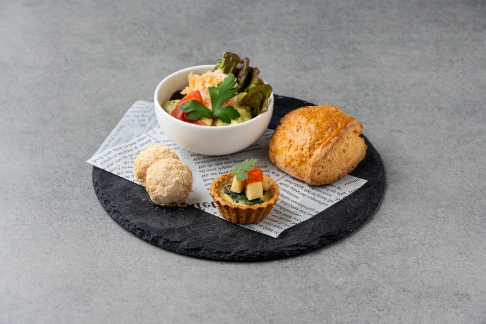 上段には冬の静けさをイメージした白を基調とした世界観、中段下段と下に進むにつれて色彩が増し、春の訪れを感じられるような全12種のセイボリーとデザートをご提供します。