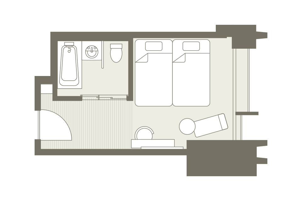 お部屋の間取りはあくまで一例です。面積や家具の配置、備品などはお部屋により異なりますので、あらかじめご了承ください。