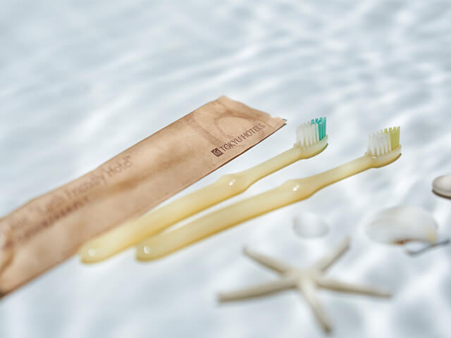 Plastic usage in Tokyu Hotels is an area we see as key for minimising our environmental footprint and being the most sustainable business we can. We have taken a number of steps to reduce the amount of plastic waste we use, leading our industry with innovative ways to cut down on waste. We are Japan’s first hotel to stock biodegradable toothbrushes made from Kaneka Corporation’s ‘Green Planet’ ® material, ending our use of plastic toothbrushes as an amenity in our hotels. These biodegradable toothbrushes are planned to be stocked across all of our hotels in 2022. We have also reduced our use of plastics across hotel rooms, by scrapping complimentary single-use plastic water bottles in favour of water coolers, as well as scrapping plastic amenities for those made from eco-friendly materials. Finally, in our restaurants we have swapped single-use plastic cutlery for recyclable alternatives. The hotel’s cutting-edge innovation represents our commitment to making our hotels as sustainable as possible, for the planet as well as for people.