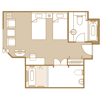 The layout of the room is only an example. Please understand beforehand that the area, the arrangement of furniture, furnishings etc. vary depending on the room.